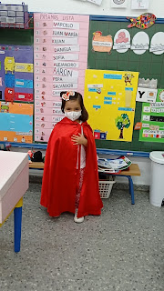 El lunes la seño Ángela nos dejó una caja enorme repleta de muchas sorpresas, en su interior había diferentes objetos que teníamos que describir y relacionar con películas....poco a poco fuimos sacando estos objetos: unas orejas de Minnie, una capa roja, una manzana, un reno, una máscara, una capa negra...
